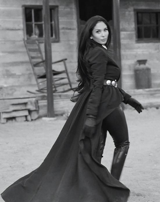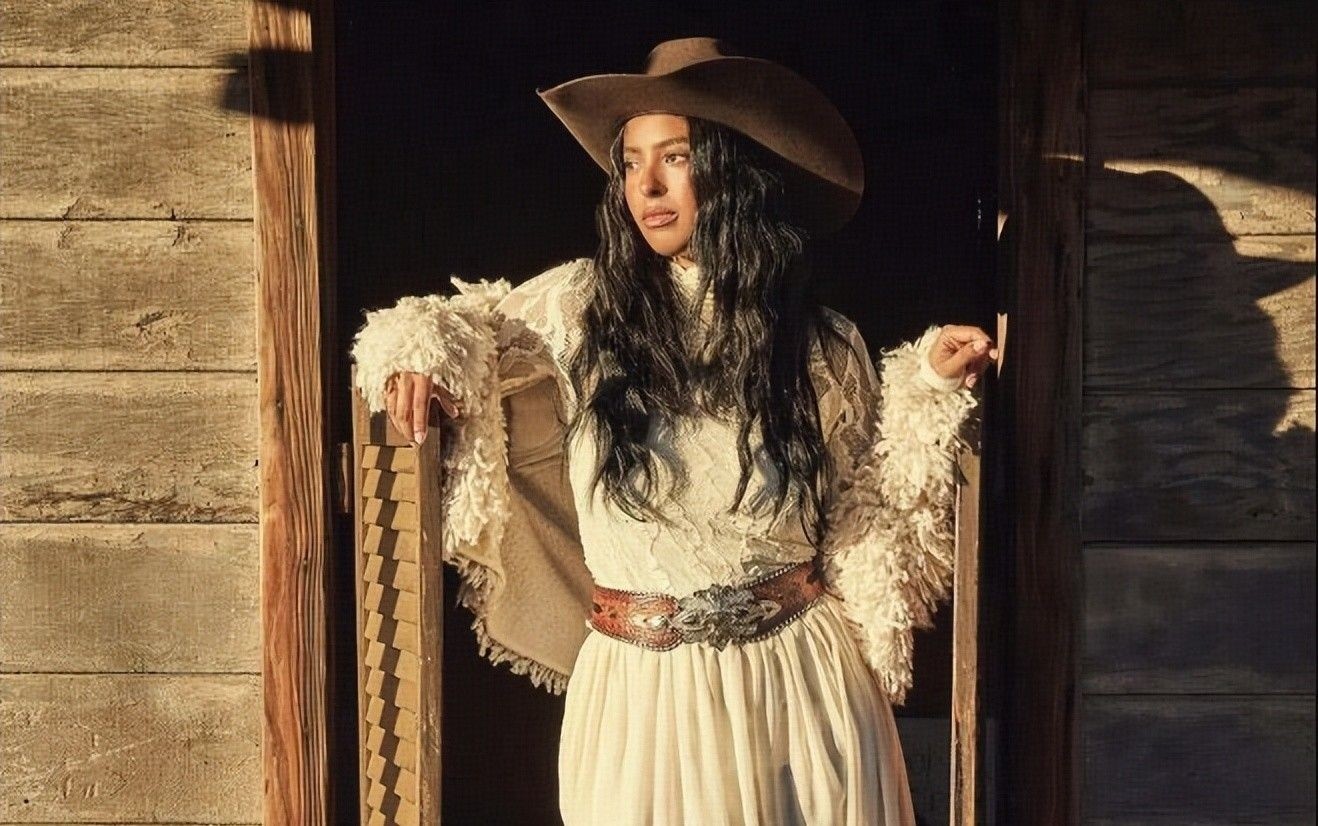 画面中的瓦妮莎身穿一袭纯白长裙,腰间束以深棕皮质宽带,勾勒出紧实纤细的腰臀曲线,搭配浅棕色宽檐牛仔帽与高筒马靴,乌黑波浪卷发自然垂落肩头,整体造型既野性又不失柔美。